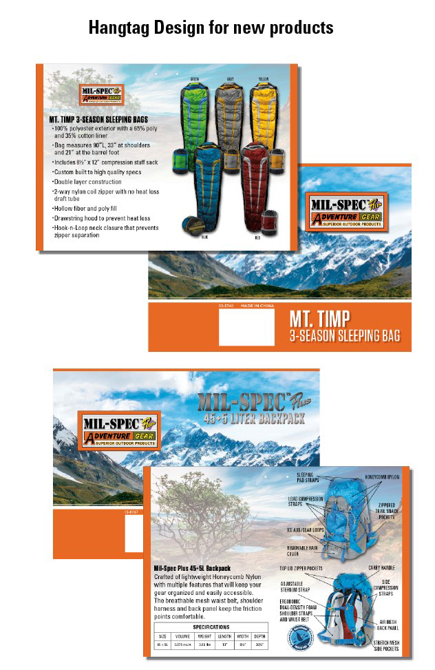 Needed to develop hangtags for new packs that fit the outdoors feel of the packs and sleeping bags